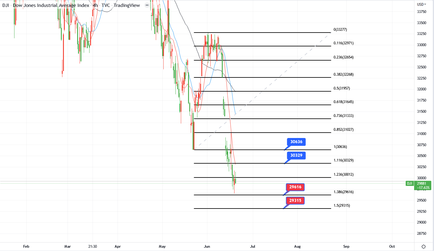 上周五美国公布5月制造业产出意外下降,被视为经济活动降温的最新迹象,美股承压格局不改。道指30000点关口确认转为阻力后,技术上留意下压,暂看4小时图底部在29620附近的支撑。
