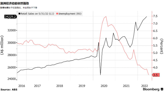 和其他主要经济体相比,澳洲经济似乎具备更多的加息优势。失业率降至1974年以来的最低水平,消费者支出稳健,商业信心强劲。在消费价格快速上涨、劳动力市场处于半个世纪以来最紧张状态、工资上涨可能进一步推高通胀。