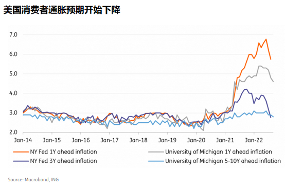 过去两个月CPI同比涨幅已经连续放缓,从9.1%降至8.3%,最新的通胀预期已经下降。纽约联储调查显示,1年通胀预期从此前的6.2%降至5.7%,3年平均通胀预期从3.2%降至2.8%,距离美联储近2%的长期目标仅一步之遥。