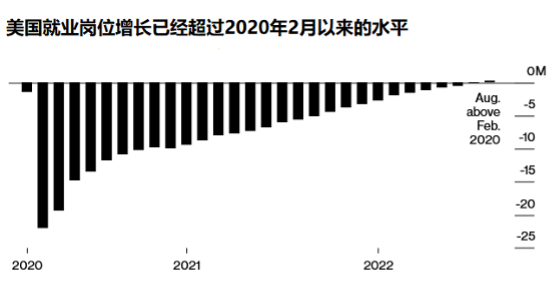 8月份就业岗位增加了31.5万个,虽放缓但依然超市场预期,现在的就业岗位比大流行前的水平高出24万个。截止8月,美国至少还有1070万个工作岗位空缺,基本上每两个职位对应一个失业者。