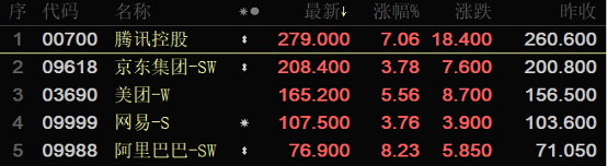 大市值个股中,腾讯控股涨幅7.06%,市价逼近300港元;阿里巴巴涨幅8.23%,市价逼近100港元。其余大市值个股的涨幅介于3%至6%之间。腾讯控股曾是港股市场第一高价股,受行业景气度降低的影响,现如今却只能排在第三位。阿里巴巴是网购领域的绝对龙头,它的股价涨跌代表着一众上市公司的股价走向,比如京东集团、唯品会、拼多多等。在互联网+板块热度不断提高的情况下,上述两支个股最值得长期关注。
