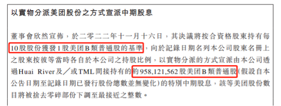 据11月16日官方公告,腾讯控股将以实物分派的方式,将所持有的美团B股普通股替代现金股息进行发放,每持有10股腾讯股票,即可获得1股美团B股红利,股权登记日为2023年1月10日。截至公告日,腾讯控股共直/间接持有10.54亿股美团股票,本次分派的9.58亿股股份直接持有方为腾讯旗下的Huai River及和TML公司,约占总持股量的90.9%。分派结束后,腾讯控股对美团的持股比例将从15%大幅降低至2%,并失去控股地位。美团创始人王兴,将以9.11%的持股比例(截至今年6月30日),重新掌舵美团系。