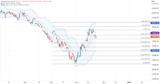 日内港股部分板块有不错的涨势,但权重科技股普遍向下拖累港股人气。恒指上周多次测试18400无果,加上近期交投量的下降,技术上调整压力加剧,当前4小时图位于布林带中轨,如果确认跌破将下望16800,回到两周前的盘整区间。