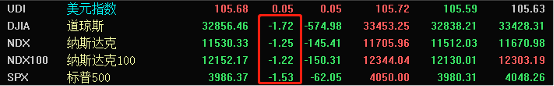 美联储主席鲍威尔在参与参议院金融委员会货币政策证词时表示:如果整体经济数据持续强劲,美联储准备加快升息步伐,终端利率或高于此前预期。一时激起千层浪,如此鹰派的发言,大大强化了美联储将会在2023年持续大幅度加息的预期。美股重挫,美元指数大涨。美国三大股票指数跌幅在1.22%~1.72%之间,美元指数从105以下飙升至将近106,金融市场迎来巨震。