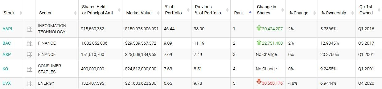 伯克希尔目前持有9.156亿股苹果股票、10.3亿股美国银行股票、1.32亿股雪佛龙股票和1.21亿股惠普股票。苹果股份价值约1,580亿美元,约占整个投资组合的45%。