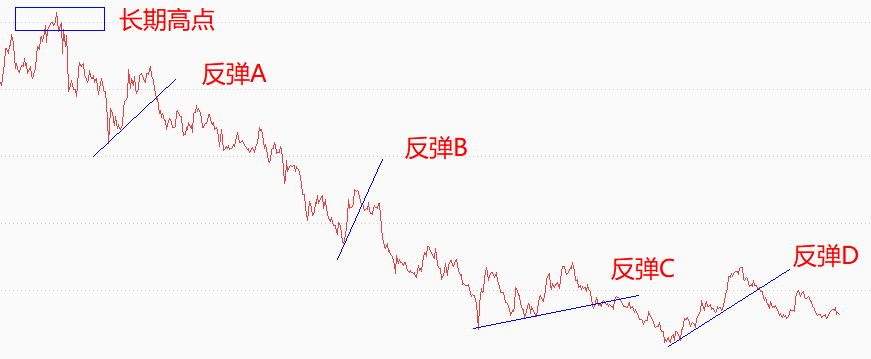 纯技术角度看,阿里巴巴仍处于空头趋势之中,最新的反弹D波段结束,市价大概率顺势下跌。长期高点形成在2020年10月份,距今两年多时间,期间经历如图中所示的四轮反弹。最新的反弹出现在去年10月至今年1月,2月中旬时市价跌破反弹D趋势线,宣告新一轮下跌走势开启。