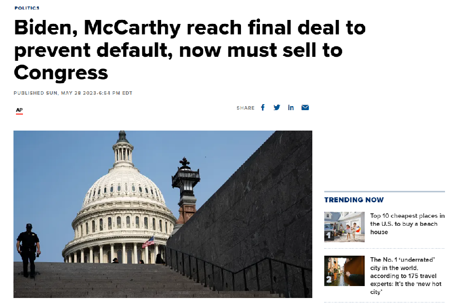 美国总统拜登和众议院议长麦卡锡持续数月的美国债务上限问题将在本周得到解决。当地时间5月28日,美国总统拜登发表讲话称,已经与众议院议长麦卡锡就提高债务上限达成最终协议,并敦促国会尽快通过该协议。预计美国国会投票将于本周三进行,通过概率极高。债务上限问题的解决避免了美国联邦政府违约,降低了美国经济陷入衰退的可能,提振投资者和消费者信心,利多美国宏观经济。