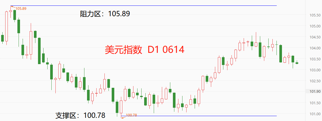技术角度看,美元指数短线处于回落态势,考虑到中期呈现震荡结构,所以本轮回落有可能达到支撑区:100.78附近。从5月31日触及高点104.7算起,美元指数已经下跌11个交易日,累计跌幅0.76%,跌势较缓。周四凌晨2:00将有美联储利率决议结果公布,维持5.25%的基准利率上限概率较高,美元指数有可能受冲击而再次下跌。需要提醒的是,美联储超预期加息的概率仍存在,果真加息25基点的话,美元指数有可能出现0.5%以上的涨幅。