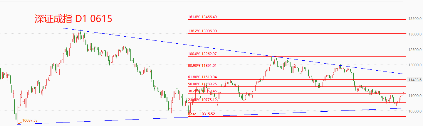 截至今日,深证成指已经连续上涨6个交易日,累计涨幅3.45%,最新值11078点,表现优于上证指数。中期看,深证成指运行于收敛三角形形态之内,市价正从区间下限10600向区间上限11700移动,短线涨势大概率延续。短期阻力位11289,短期支撑位10775点。