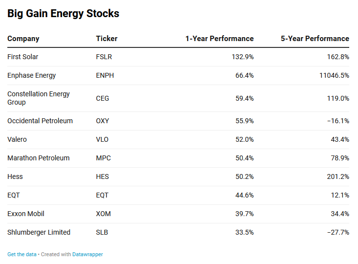 据标普道琼斯指数数据,能源股在标准普尔500指数中只占大约5%的权重,但对该指数成份股的利润影响巨大。下表为截止3月底,标准普尔500指数中过去12个月涨幅在33%以上的10家能源公司。