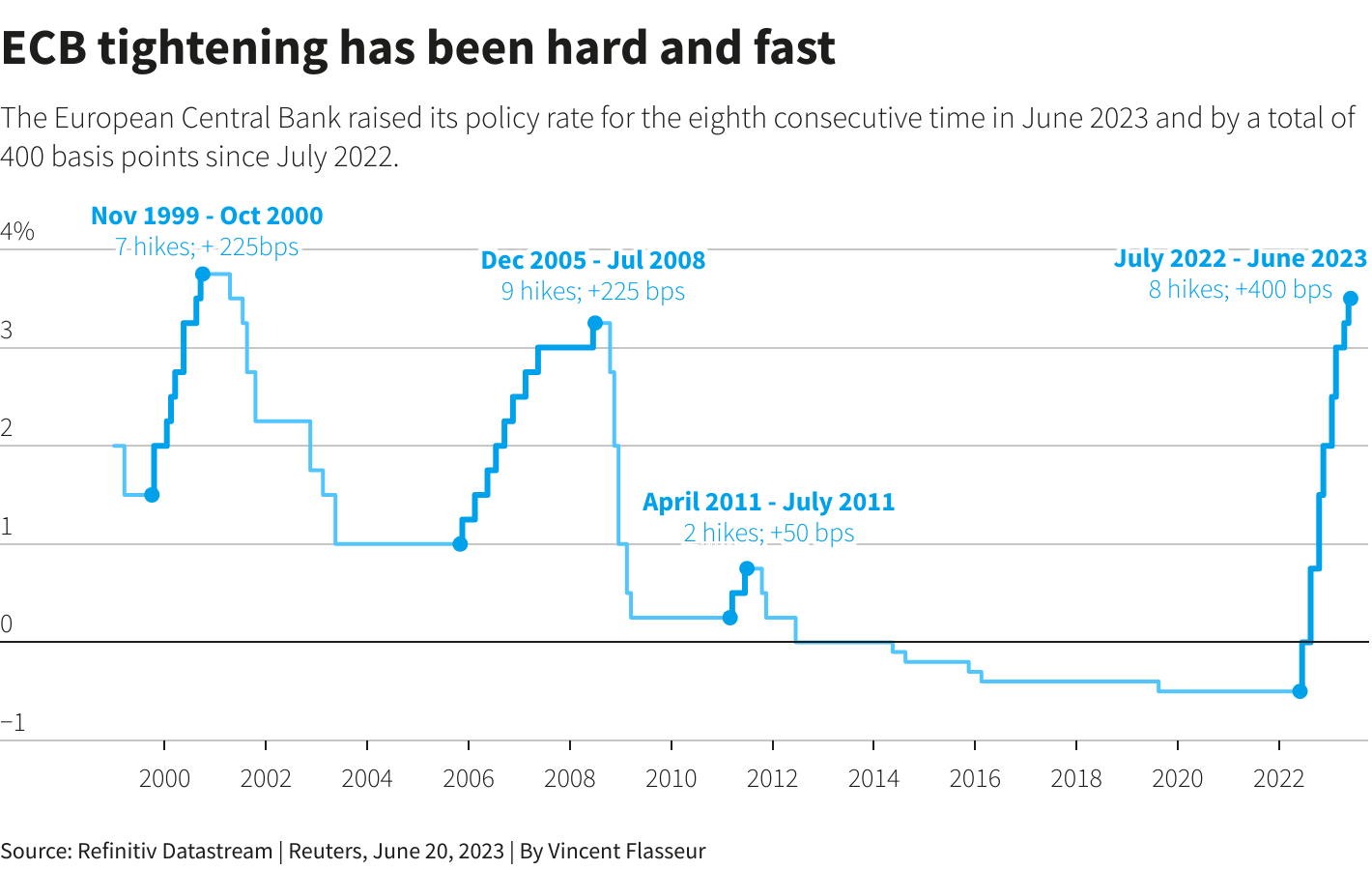当前欧央行已经加息到了3.5%,这是22年来的最高水平,今日预计继续加息25个基点,随着总体通胀降温和经济疲软,目前利率接近峰值,货币市场价格显示,7月之后还会有一次加息,表明利率将在4%左右见顶。