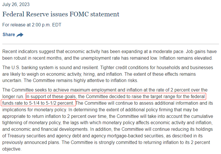 上周四,美联储宣布至7月26日美联储利率决定(上限),从5.25%提高至5.5%,加息25基点。美联储主席鲍威尔表示:家庭和企业的信贷条件收紧可能会对经济活动、就业和通胀造成压力,但是,美联储经济学家不再像之前几次会议上那样预测美国经济会陷入衰退。此番言论偏鹰派,美指受显著提振。