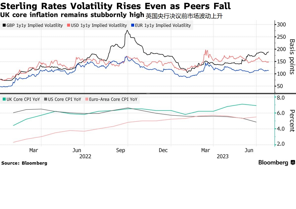 自英国央行6月22日上次加息以来,对利率将在何处见顶的押注大幅波动。在数据显示创纪录的工资增长之后,对英国央行利率见顶的预期在7月11日达到6.5%。但在上周公布的消费者价格指数降幅大于预期,创2020年12月以来的最低水平后,市场再次下调利率峰值预期。
