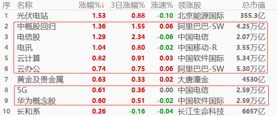 板块角度看,光伏电站以1.53%的幅度领涨,其次是中概股和电信股。涨幅榜前十当中,万亿市值板块仅占7席,占比极高,对指数的带动作用极强。与“互联网”相关的板块有7席,形成今日重点关注的交易主线。港股三大权重板块:银行、互联网、房地产的涨跌幅分别为-0.93%、-0.95%、-1.5%,普跌且跌幅较大,对恒指形成拖累。
