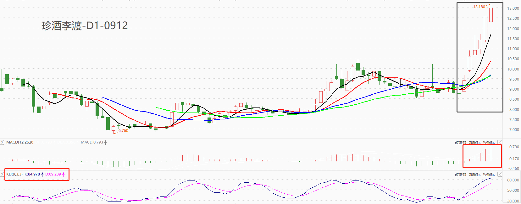 4月27日,珍酒李渡港交所上市,开盘价9.0港元,至今日盘中最高价13.18港元,累计涨幅46.44%。六个交易日之前,珍酒李渡的市价仅有8.75港元,甚至低于上市开盘价。近五成的涨幅,均由最近六个交易日的迅猛上涨造就。技术角度看,最近五根K线全阳,做多热情浓厚;均线系统呈多头结构排列,9月5日市价有效突破MA30后,至今未有显著回落;MACD连续五根柱线处于零轴之上,中短期趋势偏多;KD指标的快慢线数值分别为84.9、69.28,已经接近超买区间,存在技术性回调的可能性。综合来看,珍酒李渡的股价短线涨势迅猛,中期多头趋势也较为稳固,但震荡指标即将给出回调信号。
