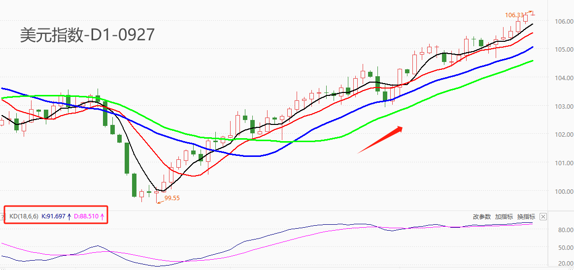 技术角度看,7月18日以来,美元指数进入强势周期,累计涨幅6.34%,最高触及106.33点。关于白宫关门的消息已经传出近一周时间,美元指数的涨幅未收到显著影响。均线系统呈发散的多头排列,长短期均线没有出现交叉的倾向,预计强势状态仍将延续较长时间。震荡指标KD的读数分别为92/88,高于80的超买线,暗示未来行情将出现技术性回调。不过,早在8月14日KD指标就已经高于超买线,至今一个多月的时间读数一直处于80上方。据此判断,在超预期牛市的冲击下,KD指标的指示作用已经失效。