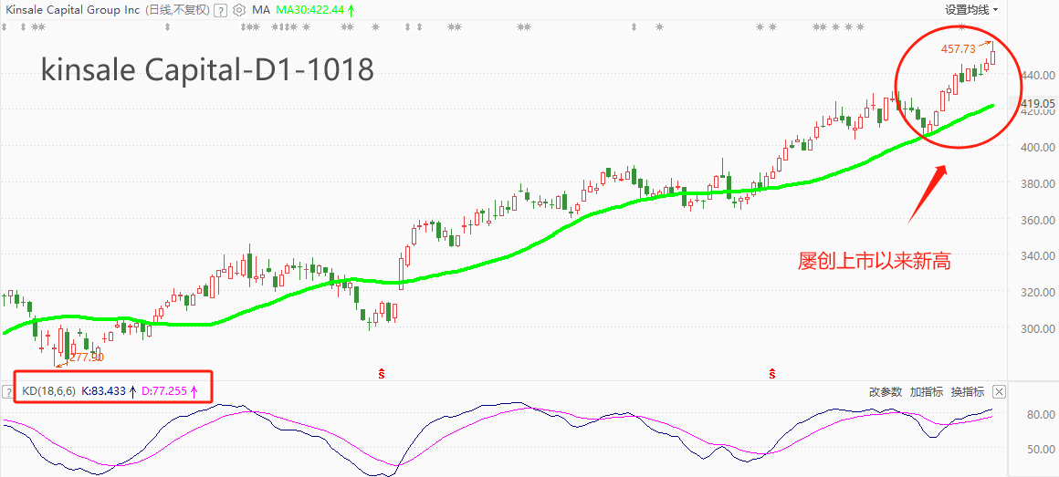 技术角度看,KNSL最近五根K线三阳两阴,且昨日阳线创出上市以来新高,短线上涨力度较强。10月2日股价跌至MA30附近,10月3日开启反弹走势,意味着MA30支撑作用有效,后市中长大概率延续涨势。震荡指标KD的读数分别为83/77,已经触及80的超买标准线,继续上涨可能引发获利盘抛售,本周随时可能展开回调走势。综合来看,KNSL的多头趋势仍将延续,但当前的上涨波段已经透支买入力量,可能随时展开回调。待寻得新支撑后(大概率在MA30附近),预计将会重启涨势。