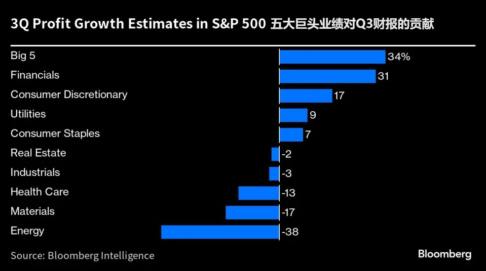 据彭博资讯编撰的分析师估计,这些公司的收益预计将比去年同期平均增长34%。标准普尔500指数整体看起来并没有那么强劲,该指数的利润预计将基本持平,但如果没有这五家巨头,它们将面临5%左右的降幅。