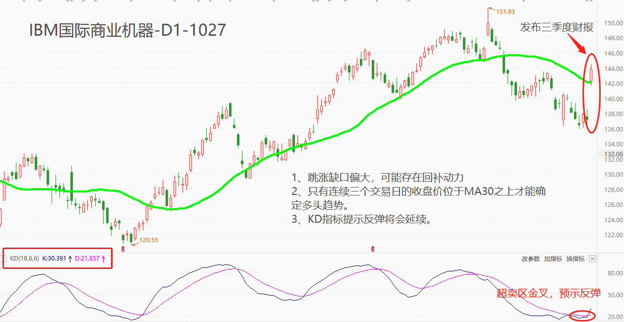 技术角度看,IBM国际商业机器的长期趋势仍然为多头,如果未来三根K线的收盘价能够处于MA30上方,能够强化多头趋势的判断。不过,三季度财报公布后,昨日股价跳涨的幅度过大,有可能激发空头发力寻求回补缺口,短期需对此保持警惕。震荡指标KD的读数处于中下区域,此前已经在超卖区间形成黄金交叉,继续上涨的空间较大,预计涨势将会延续。需要提醒的是,美国三大股指均处于中期显著空头趋势,美股市场的投资情绪非常悲观,IBM当前的涨势有可能受到严重拖累而无法持久。