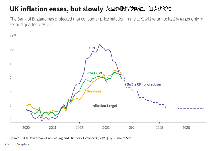 当前英国的通胀率依然是世界发达经济体中最高(达到6.7%),服务业价格增长加速反映了顽固的高薪资压力,由于迄今为止14次加息的影响尚未显现的不确定性,通胀何时能达到2%的目标也变得复杂。