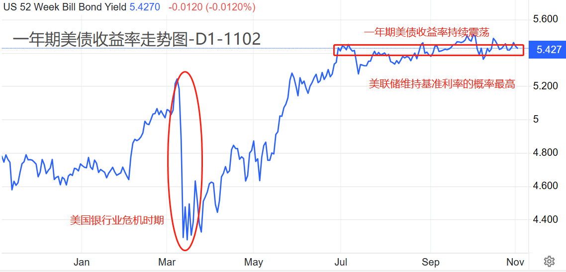 一年期美债收益率一直稳定在5.35~5.45%之间,暗示货币政策将在中期内保持稳定。十年期美债收益率最新值4.7385%,10月份的最高点为4.988%,已经出现25基点左右的下跌,意味着长周期降息的可能性提高。半年期美债收益率5.57%,高于一年期美债收益率,出现长短债收益率倒挂,意味着降息操作将会在半年时间内到来。