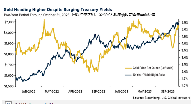 以色列-哈马斯战争爆发后,地缘政治战争溢价在推动金价的上涨。金价从每盎司1840美元的水平飙升,在10月27日直接站上了2009美元上方,为5月中旬以来的最高位,单月也创下了数十年来的最佳10月份表现。除了巴以局势外,投资者基本确认美联储已经结束了本轮加息周期,也是金价向上爆发的助攻。