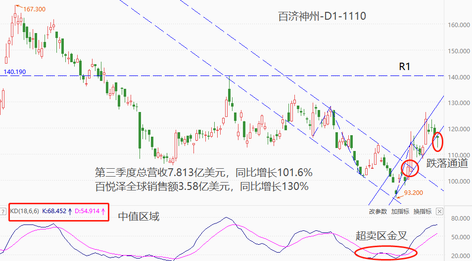 技术角度看,百济神州正处于中长期空头趋势下的反弹阶段,10月30日大涨7.99%后突破下降通达,至今的8个交易日K线运行于反弹通道内。今日开盘五分钟内的下跌导致K线落入反弹通道下方,如果收盘时市价不能重归通道内部,则有可能终结反弹阶段。上方阻力位R1为7月31日形成的高点139.9港元。震荡指标KD的读数处于中值区域,表明上方的反弹空间仍充足,10月27日在超卖区形成的金叉仍在对反弹走势起到支撑作用。