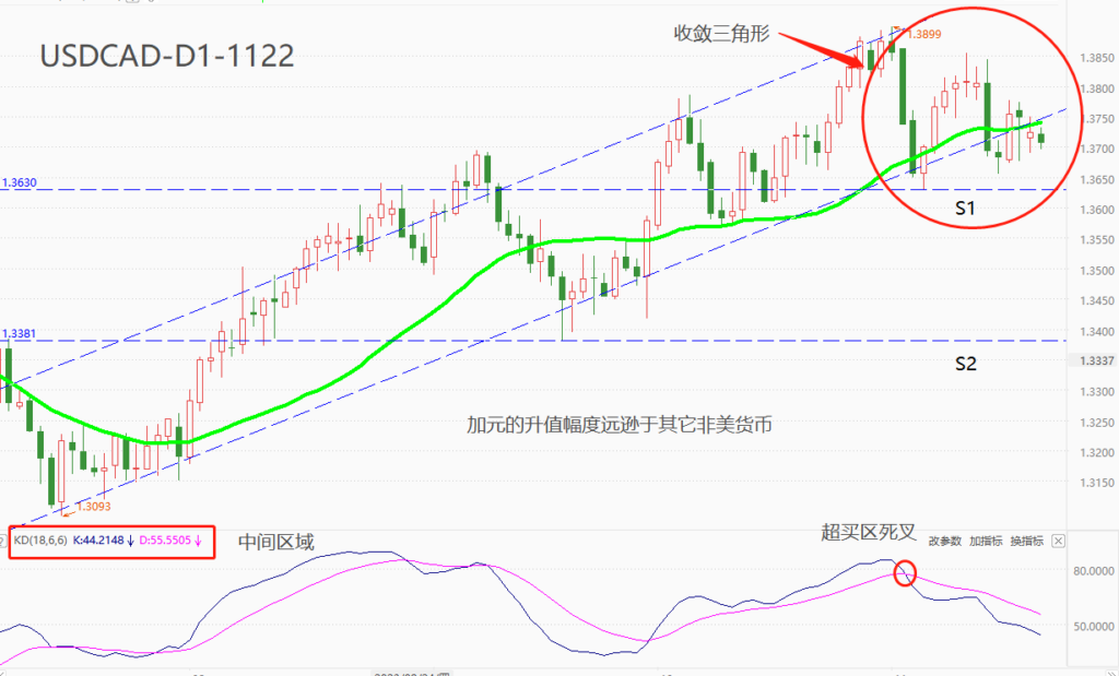 技术角度看,USDCAD处于中期多头趋势之中,7月14日以来K线都运行于上升通道之内。11月15日开始,K线不断击穿通道下轨,MA30中期均线也已被跌破,中短线出现多头趋势衰竭的迹象。年内最高点出现在11月1日,至今市价未脱离高价区,无法排除多头趋势转震荡的可能性。下方支撑位S1被跌破后,震荡状态才能宣告打破。S2为远期目标,年内触及该价位的可能性不大。震荡指标KD的读数处于中间区域,11月3日形成的超买区死叉仍对未来行情发挥作用,高位震荡的结构仍有可能转变为单边回落。