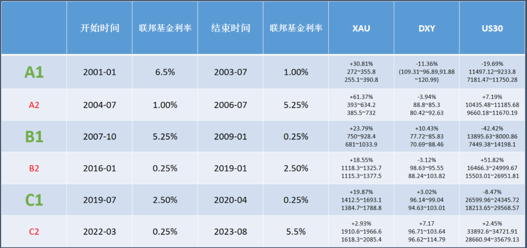 第三轮加息潮: 开始时间2022-03,联邦基金利率0.25%;结束时间2023-08,联邦基金利率5.5%,总计加息525基点。这段时间,美元指数大涨7.17%,符合逻辑。黄金先大跌后大涨,整体波动幅度不大。道琼斯指数维持宽幅震荡态势。本轮加息期间,出现了俄乌冲突、巴以冲突等地缘问题,所以黄金的走势比较复杂。加息初期,市场人士对于疫情是否完全消退仍存有疑虑,所以悲观情绪占上风,致使道琼斯指数大跌。2023年开始,市场的悲观情绪有所消解,故而驱动道琼斯指数大涨。最终,道琼斯指数呈现出宽幅震荡态势。