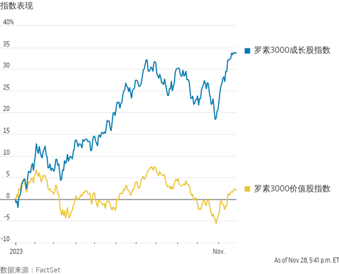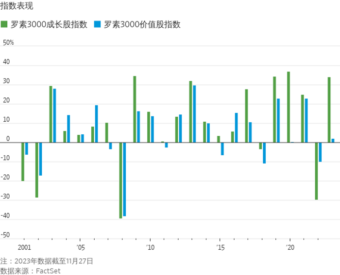 今年以来,罗素3000成长股指数前十大成分股的平均涨幅接近90%。其中,芯片制造商英伟达累计上涨超过两倍,Meta Platforms上涨约180%。价值股指数方面,前十大股票中有六只今年累计下跌:其中雪佛龙下跌近20%,主要原因是油价下跌打击了大型能源股。