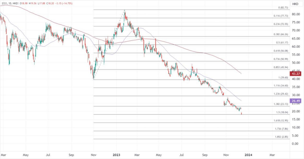 今年以来李宁股价已经跌近70%,据估算,当前的市值缩水至560.6亿港元,仅为安踏总市值的25%。当前李宁股价已经创下三年半的最低,可能继续向下在2020年3月低位14.80港元寻找下一个支撑。