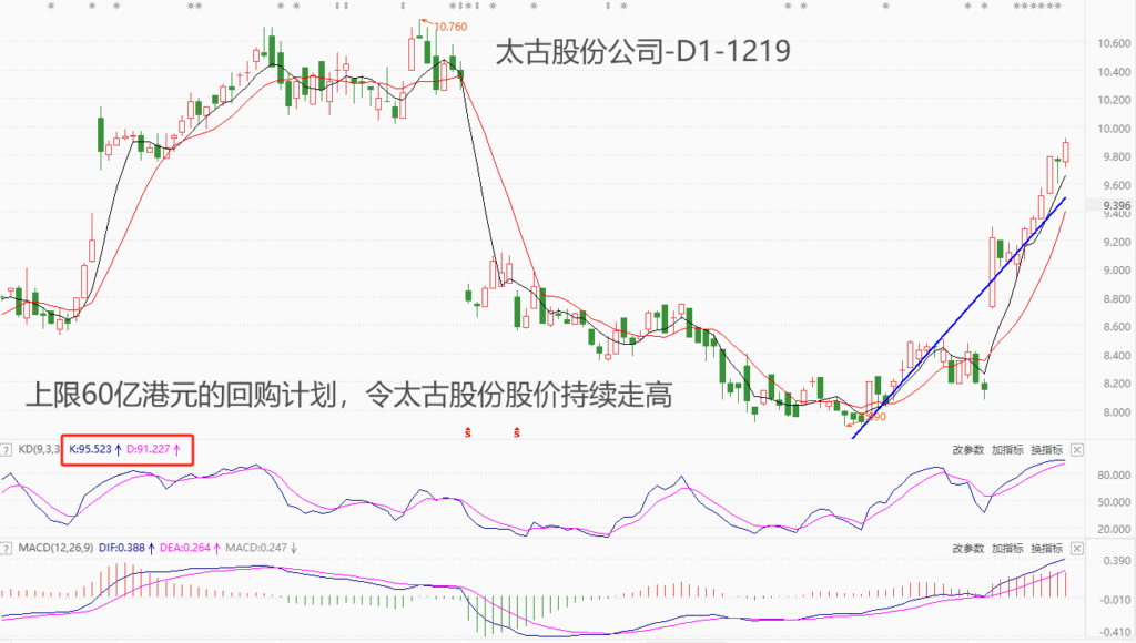 12月5日,隶属港股市场“综合企业”板块的太古股份公司发布公告称:将使用不高于60亿港元的金额回购普通A股和B股的股份,资金将以本公司可用资本和现金储备拨付。公告中还提到:股份回购的日交易量不应超过所有股份于前二十个交易日的平均每日成交量的 25%。设定每日回购量上限,显然是为了避免股价的极端波动。不过,由于回购总金额过大,所以太古股份公司的股价还是出现了非常明显的单边市。12月6日,公告发布后的第一个交易日,太古公司股价跳涨13.27%,市场情绪极为高涨。随后的几个交易日,股价延续涨势,至今日11:46,累计涨幅达到21.87%,最高触及9.92港元,距离10港元整数关口仅一步之遥。12月11日至今,太古股份公司已经发布六条回购公告,这期间股价一路走高,预计随着回购公告的继续发布,太古股份公司的股价将不断刷新月内新高点。