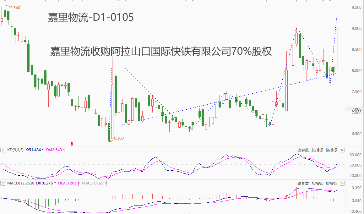 属于公用运输和物流双板块的嘉里物流股价今日出现异动:开盘价8港元,截至今日09:56,最新报价9.25港元,盘中涨幅16.35%,引发市场关注。嘉里物流的总市值143.7亿元,属于小盘股,股价剧烈涨跌符合小市值特征。消息面来看,近期有媒体报道称:嘉里物流(中国)与顺丰多式联运有限公司(顺丰控股附属)就收购事项订立买卖协议,拟收购顺丰多式联运有限公司所属的阿拉山口国际快铁有限公司70%股权。据悉,阿拉山口是我国西北地区唯一的铁路、公路、航空、管道并举的“黄金口岸”,也是中国、中亚、西亚和欧洲市场的关键联结点。对于阿拉山口国际快铁有限公司的收购,能够最大化嘉里物流公司的协同价值,股票市场以大涨回应该收购事件符合利多逻辑。
