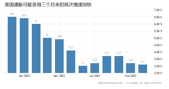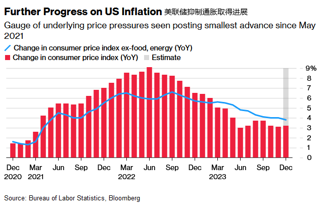 今晚市场迎来美国今年第一份通胀报告,预计12月CPI年率将录得3.3%(前值3.1%),为三个月来的首次增速加快;剔除食品和燃料的核心CPI预计同比增长3.8%(前值4.0%),这将是自2021年5月以来的最小年度涨幅,表明美联储在抑制通胀方面取得了更多进展。