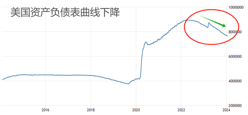 我们观察到,美联储的资产负债表总额已经显著下降,最新值约为7.67万亿美元。2022年4月份的峰值水平约为8.96万亿美元,至今的累计降幅近15%。收缩资产负债表,意味着美联储正在减少美元的供应,在不考虑货币乘数的效应下,市场流通中的美元总量处于减少状态。从这一点来看,美元仍存在长周期的升值动力。当然,中短周期的美元指数走势仍取决于降息预期的强弱变化。