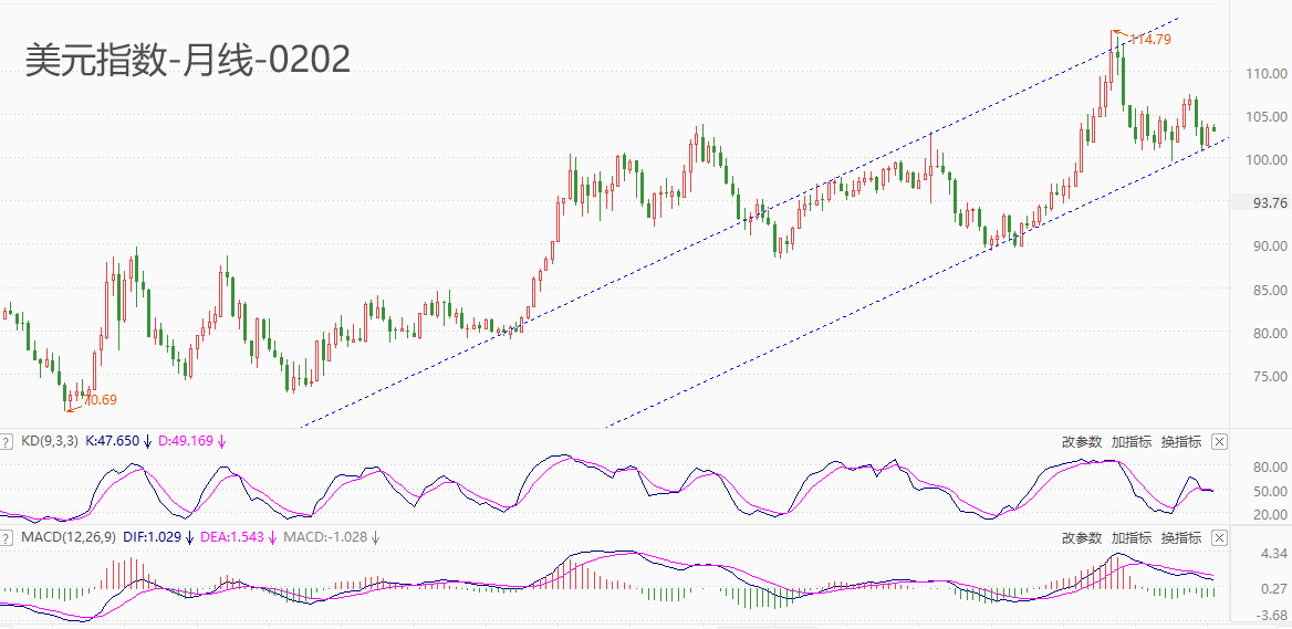 技术角度看,美元指数的月线仍呈现出稳健的上涨趋势,K线运行于上升通道线内部。今年上半年的月K线较为关键,如果出现长阴线,则市价极有可能跌破通道线下轨;如果出现长阳线,则市价将重新回到上升通道的中间区域。震荡指标KD的读数处于中间区域,快慢线横向运行,意味着月线级别的短周期走势倾向震荡。MACD指标的柱线处于零轴下方,但绝对值较短,下跌的力度并不强。综合来看,多数指标认为,美元指数的长周期走势处于多空转换的临界状态。