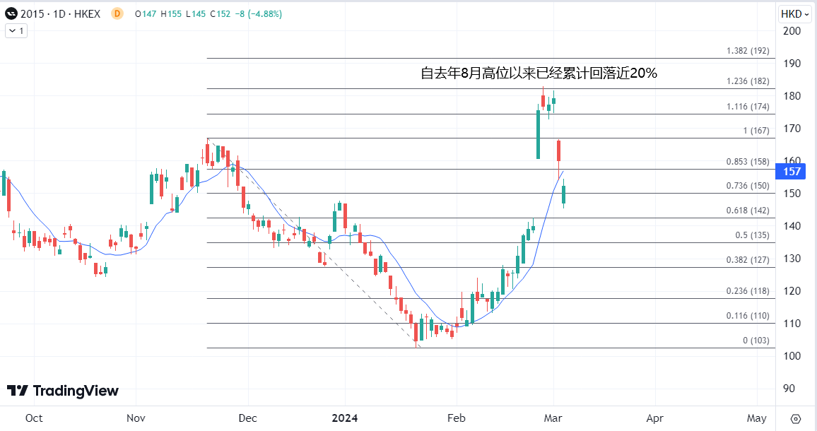 理想汽车上周在强劲业绩后一度劲升25%,最高逼近去年8月高位,但到目前已经完全回吐,今早股价一度跌逾9%止后缩减部分涨幅,在180港元上方遇阻后触发调整,当前回到均线下方,意味着可能重新进入140港元下方价位。