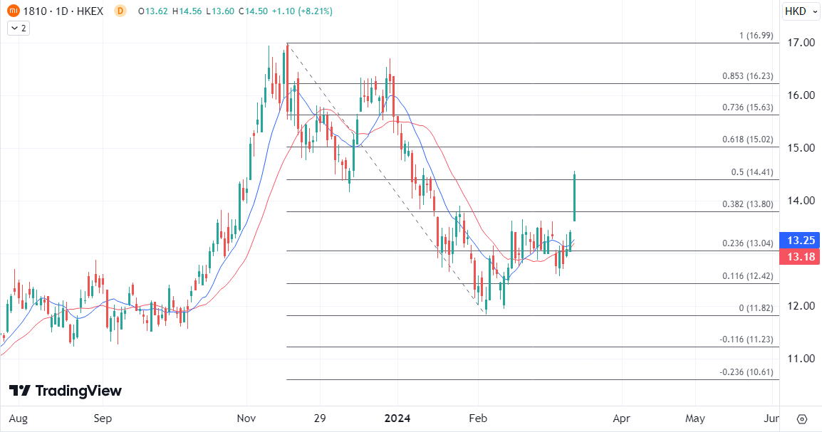 小米(01810)股价日内大涨后已经突破了近三周的区间模式,正在向15港元的下一关口靠近,若日内维持14.40上方,有望延续动力测试上述关键阻力位,但是否能实现突破进入去年底高位范围,还需要来自造车方面的更多惊喜进行带动。