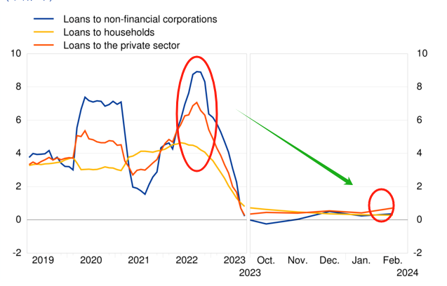 欧元区的报告中还提到了欧元区的信贷数据。私营部门2月份的信贷同比增速0.7%,高于前值0.4%;家庭信贷同比增速最新值0.3%,与前值持平;对非金融企业的信贷同比增速最新值0.4%,高于前值0.2%。各部门的信贷增速虽然同比为正,但相比2023年以前的动辄4~8%的增速仍有显著下降。信贷总额无法有效扩大,也是通胀率将延续跌势的重要佐证。