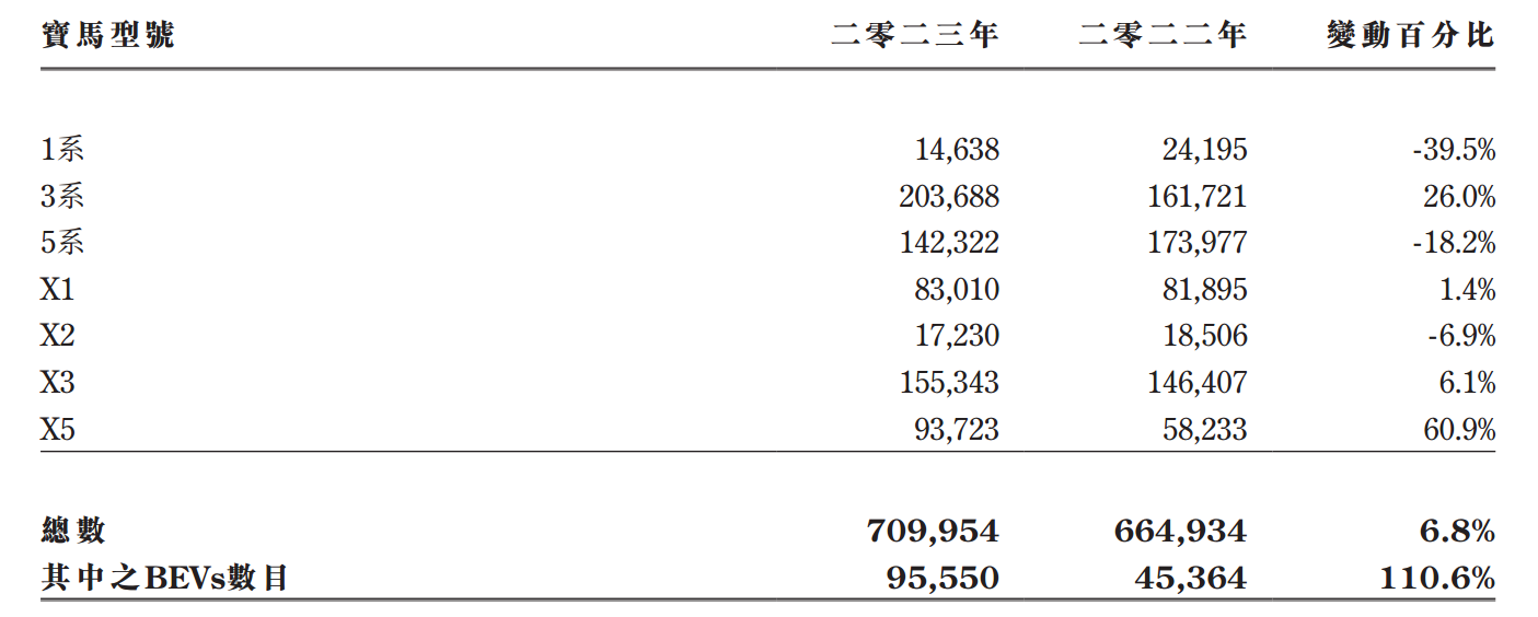 2023年华晨宝马总计销售70.9954万辆车,其中BEVs(纯电动车)9.555万,占比约13.46%。2022年BEVs的占比为6.8%,一年时间里新能源车占总销量的比重接近翻倍,可见汽车行业格局向新能源领域倾斜后对华晨宝马的深刻影响。财报中提到:2024年年初,华晨宝马开始生产全新宝马X1及首款宝马iX1,并于中国推出新一代宝马5系及首款宝马i5。分车型来看,2023年销量最好的是宝马3系,达20.4万辆;其次是宝马X3,销量达15.5万辆,两者合计占总销量的比重约50.57%,已过半。