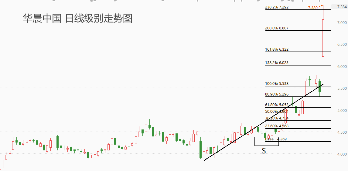 上图为华晨中国股价的日线走势图。技术角度看,华晨中国股价处于中期上涨趋势之中,本月28日公布亮眼财报后,今日股价受显著提振,盘中最大涨幅33.52%,最高触及7.38港元。不过,市价已经远离黑色回归线,从黄金分割角度看,强阻力位6.807已经被突破,继续上涨的阻力会越来越大。如果今日收盘处于6.807上方,则后市仍有望延续涨势。如果收盘价跌破6.807,则强阻力位发挥作用,走势回调概率较高。