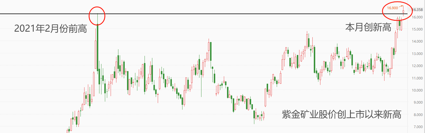 以COMEX黄金为基准,3月份累计涨幅9.74%,4月涨势延续,三个交易日累计涨幅2.91%,最高触及2308.8美元/盎司,屡创纪录新高。人民币计价的黄金也创出541.48的历史新高。受此影响,港股市场黄金板块的个股纷纷异动,尤其是从事金属矿产资源勘查、开发的紫金矿业,3月份股价大涨23.38%,本月续涨5.51%,股价突破2021年2月份高点16.24,创出上市以来新高。