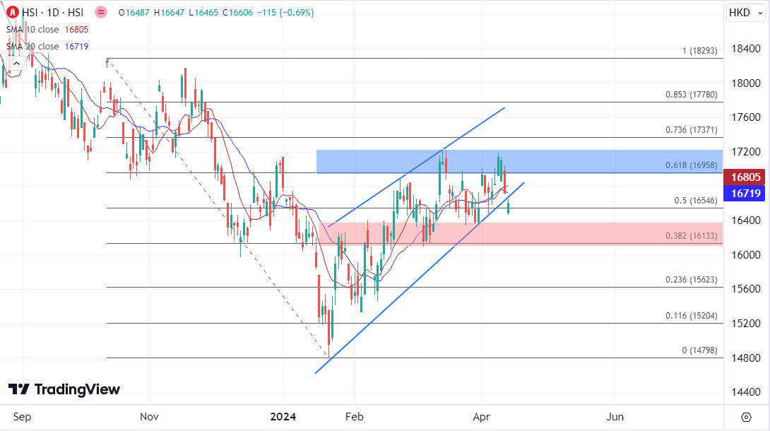 技术上恒指上周五止步连涨,确认日图均线所在的16800转为了阻力后,今早直接低开在下行通道下方,为逾一周最低位,如果日内收盘不能收复,会增加本周继续指向16400-16100支撑范围逼近的压力。