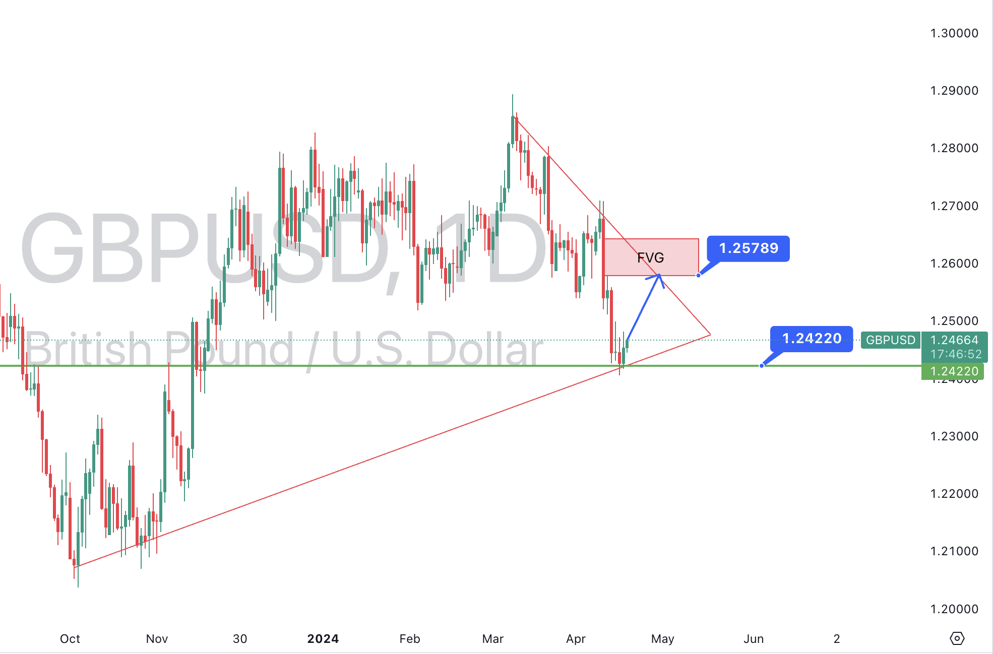 所有人都在关注即将公布的美国失业救济申请,预计人数将高于之前之21.5万,前值为21.1万。这可能是由于这些负面数据导致美元目前走弱的原因,实际数字将决定稍后美元的走向。以色列内阁会议预计将决定以色列对伊朗最近的报复性袭击的反应。如果中东地缘政治紧张局势加剧,美元有可能重新走强,从而限制英镑/美元的上行潜力。