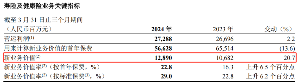 今年一季度,寿险及健康险业务实现新业务价值128.9亿元,相比2022年的106.82亿元显著提高。营运利润272.88亿元,相比2023年增长2.2%,表现超预期。需要提醒的是,基于寿险及健康险业务的长期性,上述新业务价值和营运利润均是通过合理算法计算得出,并非统计数据。