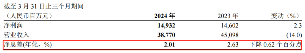 银行业务的一季度净利润149.32亿元,同比增长2.3%;营业收入387.7亿元,相比2023年同期的450.98亿元略有下降。净息差2.01%,相比2023年的2.63%下降0.62个百分点。虽然净息差略有下降,但2.01%的水平依旧处于行业平均水平,具有不错的竞争力。