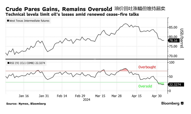 在这种情况下,实际上原油价格面临的阻力大于动力,哈马斯和以色列方面仍处于停火协议的谈判,一旦任何进展和结果传出,油价会面临更加巨大的回吐压力,除非地缘政治局势出现更多意外的混乱,才会缓和供应面制造的压力。技术上的超卖暂时缓和了进一步向下的压力,不过随着WTI原油跌至3月份的区间内,意味着77美元下方仍值得关注,甚至前低75.50美元可能再次发挥作用。对于上行而言,重新突破81美元是扭转下行压力的关键。
