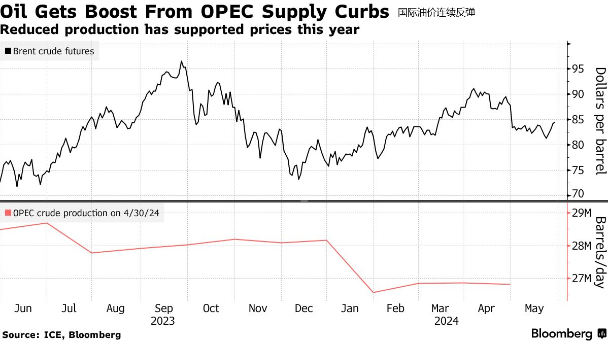 在6月初欧佩克+会议召开之前,原油价格本周二已经连续三个交易日反弹,累计上涨近3.2%。因美元走软、红海一艘散货船在穿越主要航道时遭到袭击,中东持续的紧张局势以及美国夏季驾车出行旺季的开始均支撑了油价。布伦特原油期货在周二收涨1.4%后,升至每桶84美元上方,西德克萨斯中质原油期货则站上80美元关口。
