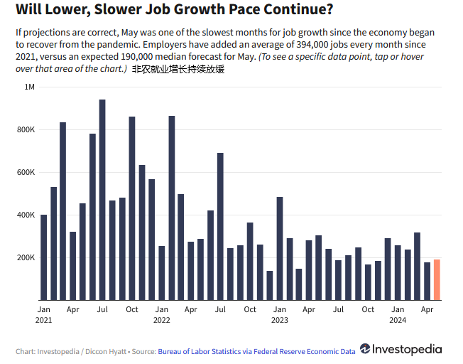 今晚市场迎来美联储下周利率决议前的最后一份非农就业报告,5月份新增就业岗位可能达到19万(前值为17.5万,也是六个月的最低),低于自2021年以来经济每月平均增加的39.4万;失业率预计将维持在3.9%,接近历史低点;平均时薪增长预计与上月持平在3.9%。