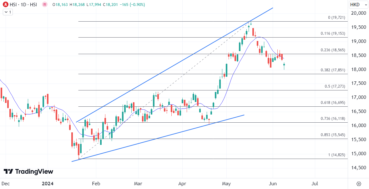在三日连跌后恒指今日一度失守万八关口,并最终失守10均线,跌至5月初来的最低位,不过18000点关口作为前低再次发挥关键的支撑,表明当前可能暂时在18500至18000之间形成盘整直至美联储决议后可能跟随外围情绪获得方向指引。